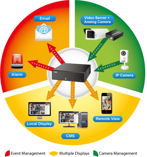 NVR-820 może być wykorzystany jako centrum sterowania i zarządzania maksymalnie 8 podłączonych kamer IP (zgodnych z ONVIF), tworząc inteligentne centrum nadzoru video. Wystarczy po prostu podłączyć kamery do rejestratora, aby zbudować system ochrony życia i mienia oparty na sieci IP. Planet NVR-820 umożliwia także przechowywanie nagrań na 2 dyskach twardych w celu późniejszej analizy. Materiały mogą być zapisywane bez potrzeby używania dodatkowego komputera PC, przez co użytkownicy otrzymują bezpieczny system monitoringu. Rejestrator jest w pełni zgodny z mobilnymi systemami operacyjnymi – iOS oraz Android, a także z przeglądarką Internet Explorer w systemie Windows.