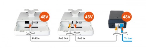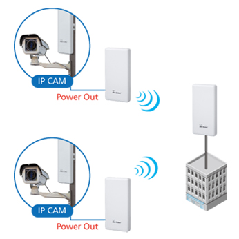 AirMax5X zapewnia zasilanie PoE 48V dla kamer IP lub kolejnych urządzeń AirMax5X. Moc wyjściowa wynosi maksymalnie do 30 W. Funkcja ta ułatwia instalatorom systemów monitoringu montaż i obsługę punktów dostępowych i kamer IP.