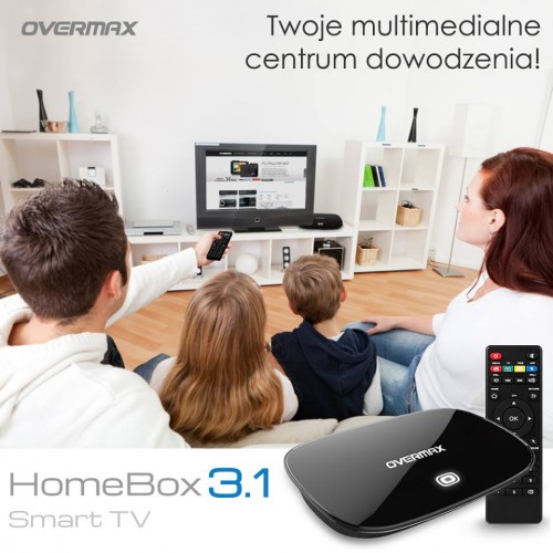 Overmax wprowadza kolejna nowość – Homebox 3.1 – wielofunkcyjne urządzenie, które zamieni Wasz telewizor w multimedialne centrum rozrywki. Internet, filmy, zdjęcia, gry – wszystko w jednym miejscu, zawsze pod ręką. Homebox 3.1 pracuje na własnym systemie operacyjnym Android 4.4 oraz posiada czterordzeniowy procesor Quadcore 4 x 1.6 GHz. Pamięć 8 GB pozwala natomiast zainstalować setki przydatnych aplikacji.