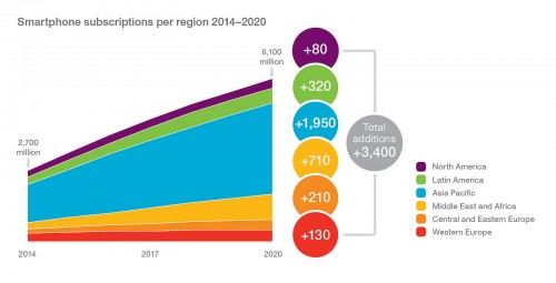 W samym tylko 2014 roku przybyło na świecie 800 mln subskrypcji działających na smartfonach (w tym nowi abonenci oraz osoby wymieniające prosty telefon na smartfon). Do 2020 roku największy wzrost zanotuje region Azji i Pacyfiku, który do tej pory cechował się małym nasyceniem rynku w segmencie smartfonów. Szacuje się nawet, że 80% smartfonów, które zostaną sprzedane w latach 2015-2020, trafi do użytkowników mieszkających właśnie w tym rejonie.