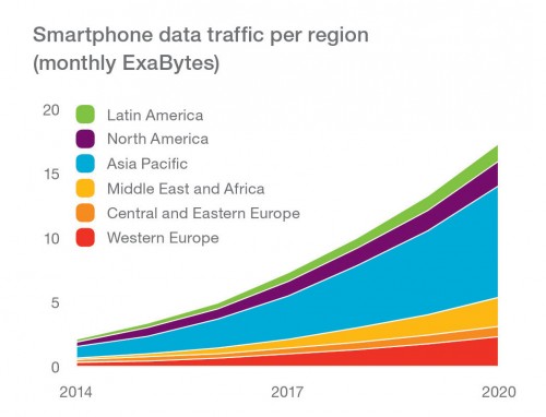 Ponad połowa ruchu generowanego przez smartfony w 2020 roku pochodzić będzie od użytkowników z regionu Azji i Pacyfiku. Stanie się tak, pomimo małej ilości zużywanych danych, przypadających na pojedynczego użytkownika. Ilość w tym regionie jest dwukrotnie mniejsza porównując zużycie danych u użytkowników z Ameryki Północnej lub Europy Zachodniej.
