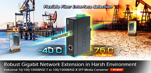 Planet IGT-805AT to przemysłowy Gigabit Media Converter, zapewniający wysoką wydajność i elastyczność połączeń przewodowych Gigabit Ethernet w ciężkich warunkach przemysłowych. Jest wyposażony w jedno gniazdo RJ-45 10/100/1000Base-T i jeden interfejs światłowodowy 100/1000 SFP, które zostały zamknięte w wytrzymałej obudowie z certyfikatem odporności IP30 i zapasowym systemem zasilania. IGT-805AT idealnie nadaje się do wdrażania systemów nadzoru i kontroli w trudnych warunkach, gdzie wymagana jest praca w szerokim zakresie temperatur. Dzięki obsłudze 9K ramek Jumbo IGT-805AT może obsłużyć bardzo duże ilości danych w bezpiecznej topologii.