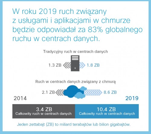 W piątej edycji corocznego badania Cisco® Global Cloud Index (2014-2019) Cisco prognozuje ponad czterokrotny globalny wzrost ruchu w chmurze w latach 2014-2019, z 2,1 do 8,6 zettabajtów (ZB) rocznie.