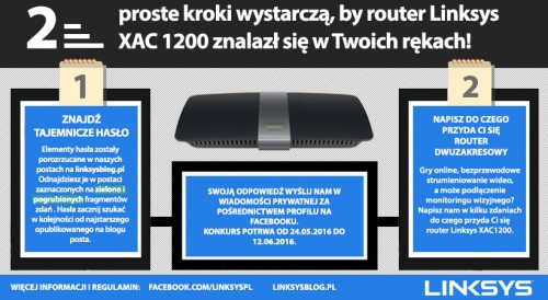 Firma Linksys na swoim profilu w serwisie Facebook ogłosiła konkurs, który potrwa od dnia 24.05.2016 do dnia 12.06.2016. Zadanie konkursowe polega na odgadnięciu „tajemniczego hasła”, którego elementy ukryte zostały w postach znajdujących się na blogu producenta (linksysblog.pl) oraz napisaniu, do czego przyda nam się router dwuzakresowy.
