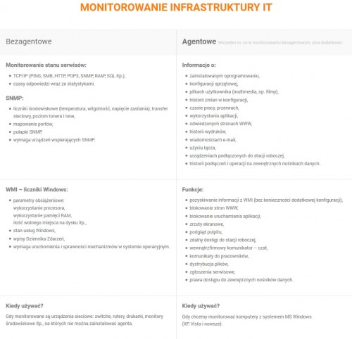 Monitorowanie i diagnostyka sieci to obecnie bardzo istotna część prowadzenia biznesu. Umiejętność profesjonalnego zarządzania infrastrukturą IT chroni przed wieloma problemami wynikającymi z jej nieodpowiedniej konfiguracji, działania szkodliwego oprogramowania lub nieautoryzowanych zachowań użytkowników. Niektóre informacje można zebrać bez konieczności instalowania dodatkowego oprogramowania, jednak jest to zaledwie ułamek wiedzy, jaką możemy uzyskać po instalacji agenta – małego programu stale monitorującego pracę systemu. To właśnie agent pozwala na pozyskanie szczegółowych informacji dotyczących konkretnej stacji roboczej czy pracy użytkowników.