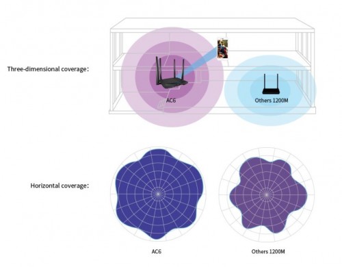 AC6 dostarczana jest w standardzie Wi-Fi Nowa generacja – 802.11ac, który zapewnia 3x szybsze połączenie niższej technologii 11n. Osiągając 300 Mbps na 2,4 GHz i 867 Mbps na 5 GHz, AC6 ma całkowitą prędkość 1200 Mbps i zachowuje pełną stabilność. AC6 do najlepszego wyboru do transmisji HD, gier online i innych pozycji tradycyjnych.