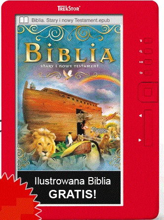 Czytnik e-booków firmy Trek Stor z wgraną kolorową Biblią obrazkową – cena za sztukę, wraz z zestawem słuchawkowym: 229, 99 zł brutto.