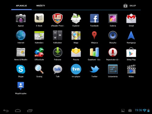 Jak już napisałem we wstępie producent przygotował czystego Androida 4.0.3 z pełnym dostępem do sklepu z aplikacjami przeznaczonego dla Androida – Google Play. Razem z tabletem otrzymamy kilka wartych uwagi programów: autorski czytnik e-book z dostępem do wirtualnej księgarni Prestigio, przeglądarkę plików, klienta FTP ES File Explorer oraz pakiet biurowy OfficeSuite PRO – pozwala on na pracę nad dokumentami tekstowymi, prezentacjami oraz arkuszami kalkulacyjnymi.