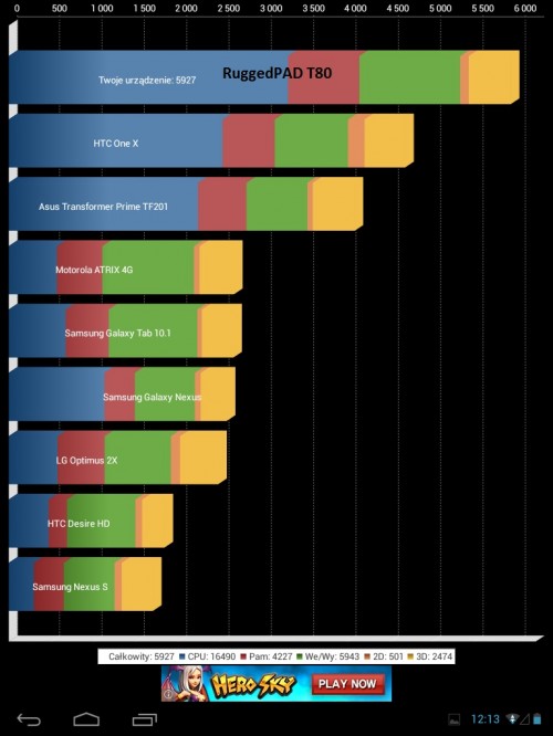 Nie są to parametry, które plasowałyby RuggedPAD T80 wśród topowych urządzeń z Androidem. Mimo to nie zauważyłem najmniejszych problemów z płynnością działania zarówno interfejsu, jak i aplikacji. Oczywiście nie jest to poziom wydajności i płynności interfejsu spotykany w znacznie mocniejszych urządzeniach mobilnych. Nie miałem większych problemów z uruchamianiem gier, tylko przy tych bardziej zaawansowanych sporadycznie zdarzały się przeskoki w animacjach interfejsu. Zresztą nie ma to większego znaczenia, bo nikt chyba nie będzie oczekiwał, że pancerny tablet posłuży jako odtwarzacz multimediów. A gry będą ostatnim, do czego wykorzystywać będziemy tego typu urządzenie. Dla miłośników testów wydajnościowych, poniżej wyniki popularnych benchmarków.