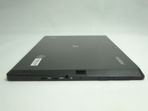 Na krawędziach dzieje się zdecydowanie więcej. Po lewej stronie ulokowano zestaw portów takich jak micro USB, micro HDMI oraz jack audio 3,5 mm, a także slot na karty microSD o pojemności do 32 GB. Trochę wyżej mamy jeszcze przycisk home oraz regulacji głośności, natomiast w dolnej części znajduje się jeden z głośników stereo.