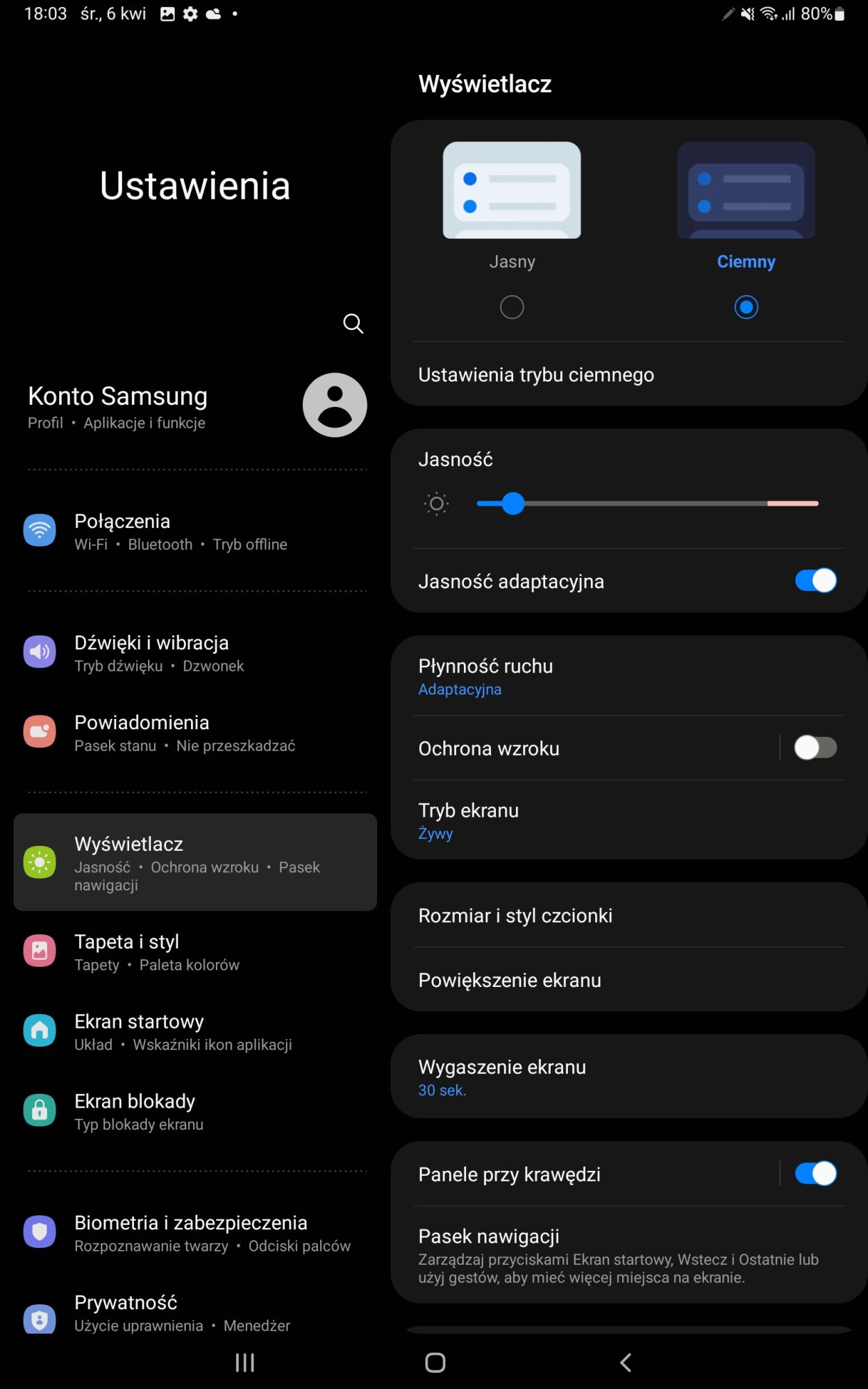 Na przodzie Samsung Galaxy Tab S8 11’’ 5G umieszczono dotykowy wyświetlacz TFT 11’’ o rozdzielczości 2K (2560 x 1600), 274 ppi, jasności 500 nitów, adaptacyjnym odświeżaniu 120 Hz i ochroną oczu potwierdzoną certyfikatem TÜV Rheinland Eye Comfort. Niewielkie ramki wokoło sprawiają, że sam wyświetlacz zajmuje do ok. 83,6% powierzchni ekranu. W oprogramowaniu możemy standardowo zmienić jasność, przełączyć się na tryb ciemny czy zmienić kolory pomiędzy opcją żywy i naturalny.