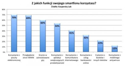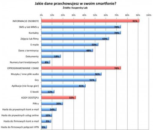 Co ciekawe, aż 20% uczestników ankiety poinformowało, że ich smartfon został przynajmniej raz skradziony lub zgubiony. Niestety wraz z chęcią noszenia informacji ze sobą nie idzie należyta ochrona – z hasła zabezpieczającego dostęp do smartfonu korzysta niewiele ponad połowa ankietowanych osób, mimo że funkcję taką posiada każde tego typu urządzenie.