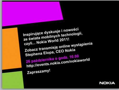 Warto dodać, informację, która obiegła 'przeddzień Nokia World, iż dyrektor Generalny firmy Nokia, Stephen Elop twierdzi, że Amerykanie nie dostaną smartfonów Nokii z Windows Phone wcześniej niż w pierwszym kwartale 2012 roku.