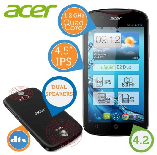 Acer Liquid E2 DUO quad – core z podwójnym slotem kart sim, został wyposażony w procesor taktowany zegarem 1,2GHz i 4,5’’ wyświetlacz z rozdzielczością 540×960 pikseli. Acer Liquid E2 DUO posiada takż aparat 8MPix.