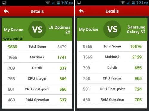 Mechanicznym sercem telefonu jest 2-rdzeniowy procesor MT6572M o taktowaniu 1 GHz, wspomagany przez 512 MB pamięci RAM i układ graficzny Mali-400. Podzespoły poprawnie radzą sobie z obsługą interfejsu Androida, nie ma także problemu z przeglądanie stron internetowych. Z powodzeniem można na nim odpalić nawet nowsze gry. Liquid Z3 uzyskał przyzwoity wynik 9565 punktów w benchmarku AnTuTu.
