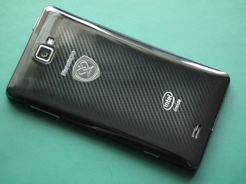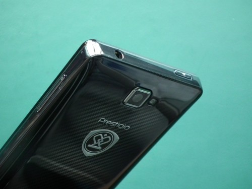 Na tylnym panelu, którego grafika oddaje efekt włókna węglowego – skądinąd ciekawe stylistycznie producent umieścił lekko wystające, dlatego podatne na porysowania oczko aparatu z diodą LED. Poniżej mamy logo Prestigio, niżej logo koncernu z Santa Clara – Intel Inside oraz dwie szczelinki tylnego głośnika.