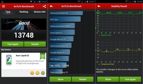 Acer Liquid E2 V370 wykorzystuje 4-rdzeniowy procesor MediaTek MT6589 (ARM Cortex-A7) o częstotliwości taktowania 1,2 GHz, z chipem graficznym PowerVR SGX544MP, który wspiera 1-gigabajtowa pamięć operacyjna RAM. Wydajność samego systemu jest bardzo dobra i wystarczy do uruchomienia popularnych gier ze sklepu Google Play.