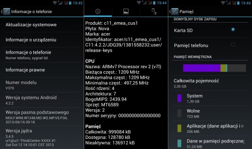 W telefonie działała wersja Android 4.2.2 Jelly Bean. Acer nie ingeruje zbytnio w „gołego” Androida.