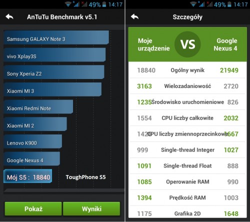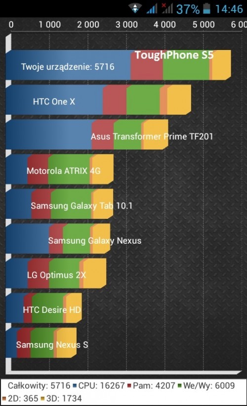Nie wiem po co robić benchmarka w którym porównuje się nowe urządzenia z takim starocia mi jak desire hd, nexus s czy motorola atrix. Strata czasu testera 😉 Co do urządzenia, za 2500zł wszystko w tym telefonie jest niedopracowane i jedyny plus to tylko odporność, którą jak widać, producent przeszacował(lub przy której stracił kontakt z rzeczywistością)