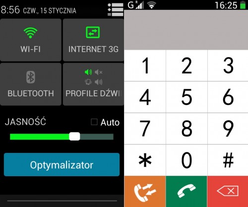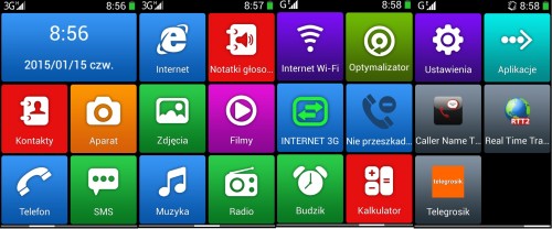 Menu zostało podzielone na duże – intuicyjne kafelki, dzięki którym można błyskawicznie nawiązać połączenie, wysłać smsa, czy też połączyć się z Internetem. Domyślnie na ekranie głównym preinstalowano 4 kafelki, jednak użytkownik może swobodnie dodawać i usuwać kolejne aplikacje w zależności od swoich upodobań. Dodatkowo, urządzenie posiada tylko jeden przycisk systemowy, zamiast trzech przycisków znanych ze standardowych wersji Androida.