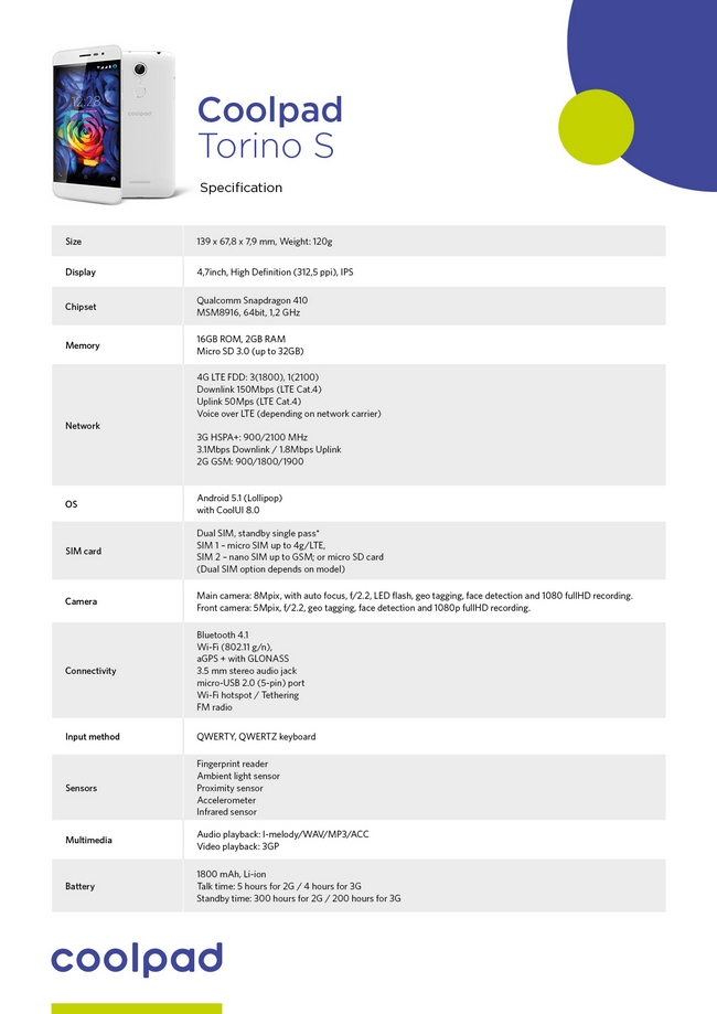 Coolpad Torino S jest zainspirowany naturą, dlatego ma wyjątkowy kształt i jest delikatny w dotyku, a zakrzywione szkło 2.5D nadaje mu wyjątkowy wygląd. Torino S jest wyposażony w wyświetlacz 4,7 cala o rozdzielczości HD (1280 x 720, z 312,5 pikseli na cal) i czytnik linii papilarnych. Ponadto, smartfon ten umożliwia Dual SIM, obsługę superszybkiej sieci LTE, 2 GB pamięci RAM + 16 GB pamięci ROM, jak również gotowością do rozbudowy o kartę Micro SD. Torino S zawiera procesor Qualcomm Snapdragon 410 Quad Core 1.2GHz. telefon pozwala użytkownikowi zaprogramować skanowanie odcisku palca dla 5 palców i realizację różnych zadań: odblokowanie, uruchomienie aplikacji, szybkie zdjęcie lub selfie, nagranie rozmowy i bezpieczne płatności. Czytnik linii papilarnych jest tak szybki, że odblokowanie trwa pół sekundy, a zrobienie zdjęcia 0,24 sekundy. Czujnik jest również w 99,9% niezawodny, nawet gdy palce są mokre. Smartfon posiada powłokę, która została sprawdzona poprzez test 10 milionów dotknięć.