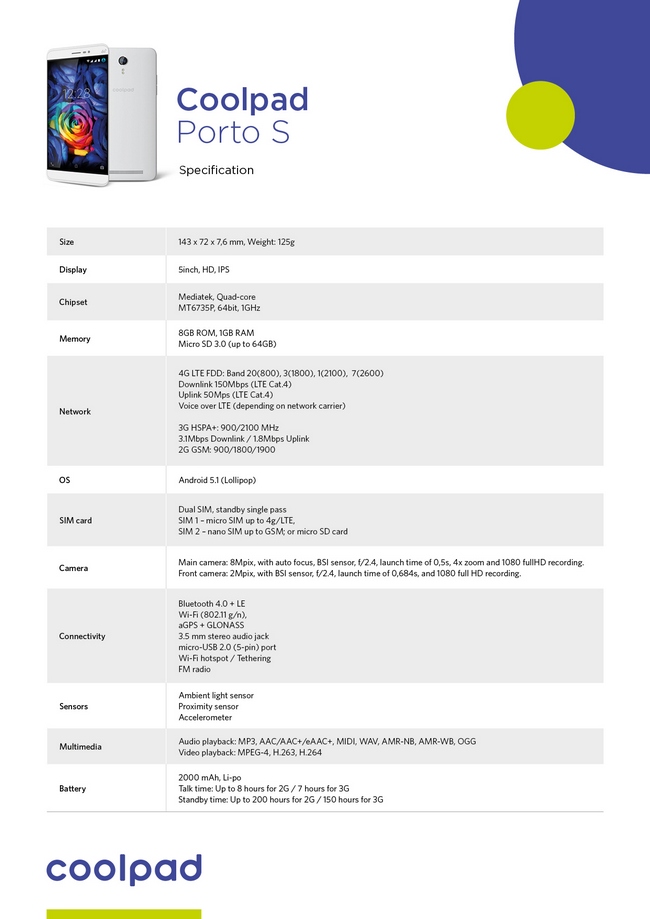 Coolpad Porto S oferuje obraz na pięcio-calowym ekranie o rozdzielczości HD (1280×720 – 294 pikseli na cal). Silnik Miravision polepsza jakość obrazu, zaś poprzez dostęp do superszybkiej sieci 4G LTE, możliwe jest sprawne przesyłanie i odbieranie plików. Dual SIM umożliwia używanie dwóch kart SIM, np. z numerem prywatnym i służbowym, albo jednej karty SIM i karty microSD. Mimo, że jest to smartfon, Porto S można łatwo używać do oglądania ulubionych programów telewizyjnych lub połączeń wideo, gdyż korzysta z LTE dla rozmów w technologii high-definition.