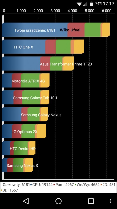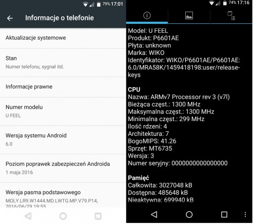 Wiko Ufeel do stabilnej, a co najważniejsze płynnej pracy wykorzystuje 64bit. procesor Quad-Core MediaTek MT6735 (Cortex-A53), którego każdy rdzeń taktowany jest z częstotliwością 1,3GHz. Za grafikę odpowiada zaś układ ARM Mali-T720 MP2, 600 MHz. Pamięć operacyjna urządzenia (RAM) to 3 GB, a pamięć ROM, to 16 GB, z tego dostępne dla użytkownika ok. 10GB. Taka konfiguracja w zupełności zaspokaja większość multimedialnych zachcianek (Internet, gry, muzyka, zdjęcia, oglądanie wideo). Wydajność samego systemu jest dobra i dotyczy to nawet bardziej wymagających i zaawansowanych gier. Jeżeli chodzi o odpowiedź na pytanie, czy się grzeje?, które często zadajecie przy okazji testów. Da się odczuć podniesienie temperatury, szczególnie w górnej części obudowy, w czasie wykonywania operacji takich jak np. intensywne wykorzystanie telefonu podczas grania. Jednak nie zauważyliśmy, aby to miało jakikolwiek wpływ na działanie telefonu.