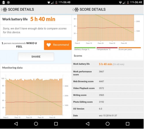 W naszym teście obciążeniowym PCMark sprzęt wyłączył się po 5 godzinach i 40 minutach. Co jest średnim wynikiem, w tej grupie smartfonów.