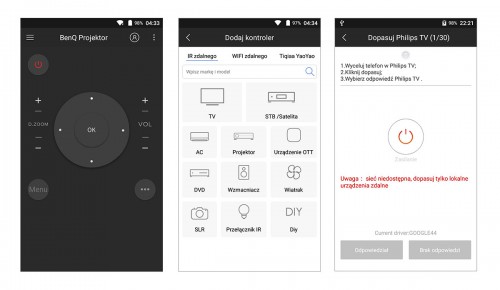Aby skonfigurować nowego wirtualnego pilota, wystarczy wybrać kategorię i producenta urządzenia, a następnie postępować zgodnie z instrukcjami na ekranie smartfona. Zwykle konfiguracja trwa nie więcej, niż minutę. Od tej chwili wszystkie funkcje telewizora, czy wieży hi-fi obsłużymy z ekranu smartfona.
