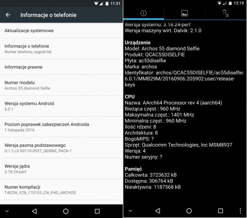Testowany Archos 55 Diamond Selfie pracuje pod kontrolą „czystego” systemu Android 6.0 Marshmallow, o aktualizacji do nowszej wersji 7.0 Nougat na razie nic nie wiadomo.