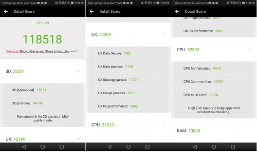 Aplikacja porównująca wydajność tabletów i smartfonów z systemem Android, Quadrant Standard Edition i AnTuTu Benchmark plasują urządzenie na poziomie najnowszych flagówców wprowadzonych na rynek w roku 2017.