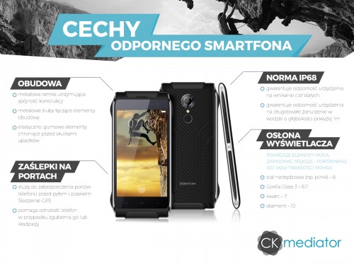 Od kilku lat w ofertach producentów sukcesywnie pojawiają się modele odporne na działanie czynników środowiska. Przykładem takiego telefonu w cenie poniżej tysiąca złotych może być dostępny w polskiej dystrybucji CK MEDIATOR wodoodporny smartfon HOMTOM HT20 Pro (Test Homtom HT20 Pro – pancerny smartfon do koszuli). Urządzenia tego typu charakteryzują się zwartą konstrukcją zabezpieczoną ze wszystkich stron gumowymi wykończeniami. Elementy obudowy połączone są ze sobą śrubami, dzięki którym smartfon nie rozpadnie się w razie upadku. Wiele modeli wspiera też normy IP67 i IP68. Litery tego oznaczenia odnoszą się do słów „International Protection”, zaś cyfry do klas odporności. Pierwsza z nich to oznaczenie odporności na wnikanie ciał stałych (gdzie 6 stanowi klasę najwyższą, kompletną ochronę przed ich wnikaniem), a druga oznaczenie odporności na działanie wody. Osiem oznacza, że urządzenie jest odporne na długotrwałe zanurzenie w wodzie powyżej 1 m głębokości. Taki telefon można więc bez obaw zabrać ze sobą nawet na plażę, jeśli tylko odpowiednio pozamyka się wszystkie jego klapki zabezpieczające umieszczone na wejściach portów.