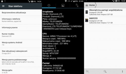 Telefunken Diamond LTE Gold napędzany jest procesorem czterordzeniowym firmy Mediatek MT6735, o częstotliwości taktowania 1,3 GHz, przy wsparciu 1GB pamięci operacyjnej RAM. Dorzucenie karty microSD jest dobrym pomysłem – fabrycznie otrzymujemy 8 GB (ok. 7GB dla użytkownika) wolnej pamięci.