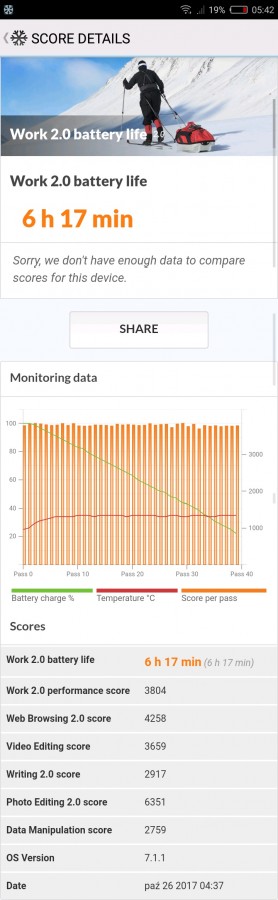 Przeprowadzony test realnej pracy, przeprowadzony programem PC Mark pokazał 6 godzin i 17 minuty. Reasumując, bateria z szybkim ładowaniem jest też mocnym argumentem do zakupu tego smartfona.
