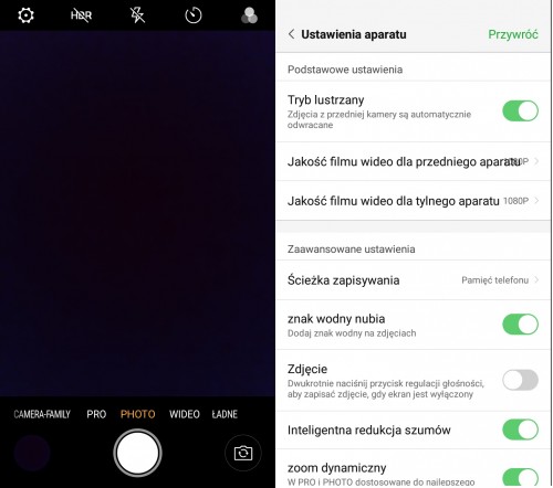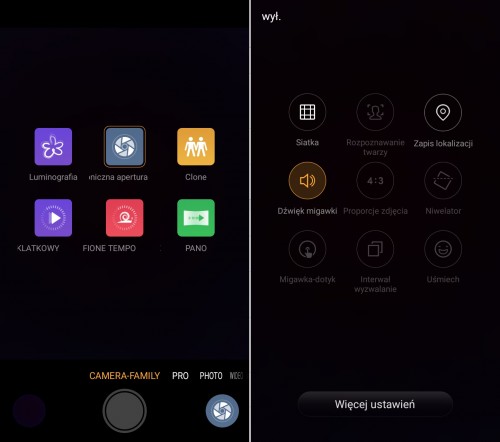 Interfejs do przełączania pomiędzy ustawieniami różni się, od tego znanego z aplikacji Androida. Moim zdaniem jest on bardziej intuicyjny i bardziej przyjazny dla użytkownika. aplikacja oferuje szeroką gamę filtrów zdjęciowych, które są stosowane w czasie rzeczywistym na ekranie w momencie wykonywania zdjęcia lub nagrywania filmu wideo.
