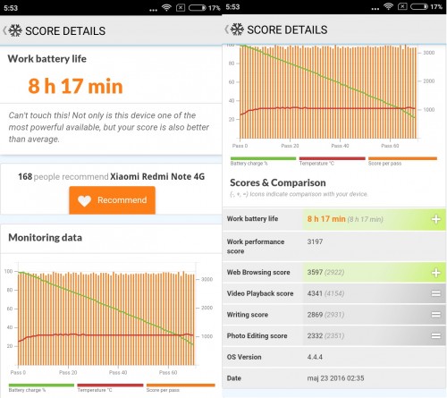Przeprowadzony test realnej pracy, przeprowadzony programem PC Mark pokazał 8 godzin i 17 minut. Pozostała energia ok. 17%, w razie potrzeby dałaby nam jeszcze przeprowadzić kilka ważnych rozmów. Reasumując, bateria jest też bardzo mocnym argumentem do zakupu tego smartfona.