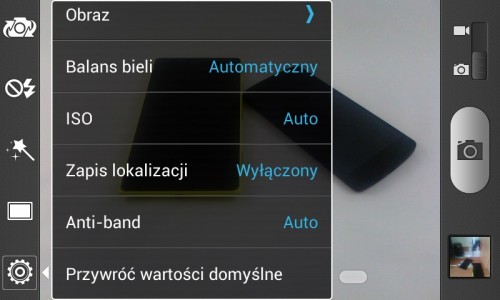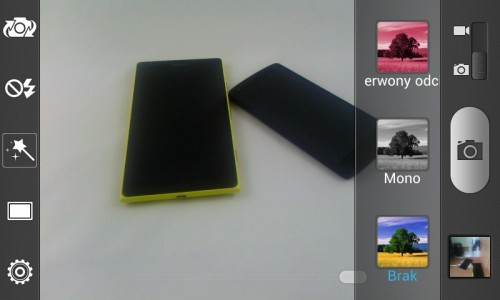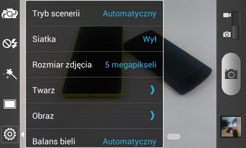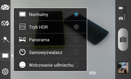 Opcje są całkiem rozbudowane, znajdziemy tu między innymi ustawienia ISO, balansu bieli, redukcji czerwonych oczu, tryb HDR, panoramy, efekty kolorystyczne czy wykrywanie uśmiechu. A nie, przepraszam, w telefonie napisano raczej „Wzkrzwanie uđmiechu”.