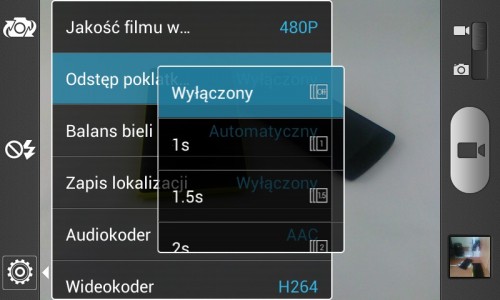 Po przełączeniu na tryb nagrywania wideo, wśród okrojonych ustawień, najciekawszą opcją wydaje się być tryb poklatkowy, który pozwala na robienie zdjęć co 1 do 10 sekund i tworzenie z nich filmu poklatkowego, odtwarzanego ze standardową prędkością 24 klatek na sekundę.