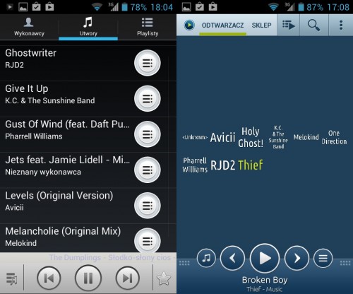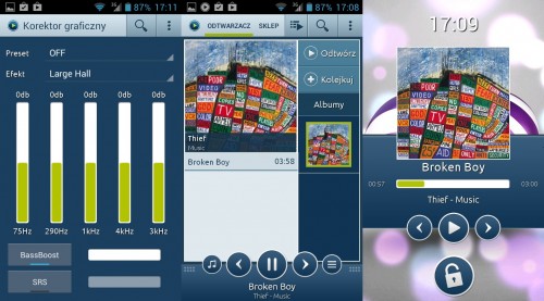 Podczas słuchania muzyki możemy łatwo sterować odtwarzaczem, dzięki jego implementacji na ekranie blokady. Sam dźwięk generowany przez telefon jest przeciętnej jakości, na słuchawkach brakuje mu nieco głębi i szczegółowości. Głośnik zewnętrzny jest głośny i na maksymalnym poziomie czasami tylko lekko trzeszczy.